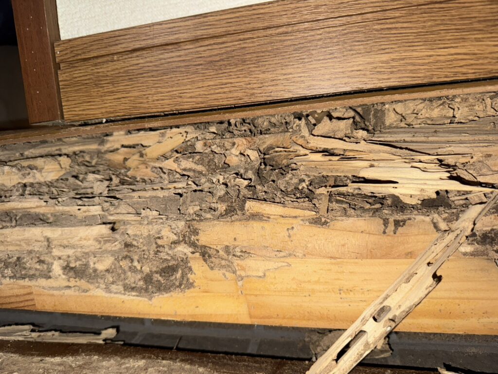 見た目では分かりにくい場所ですが、解体してみると内部は木材がボロボロに食害されている状態。