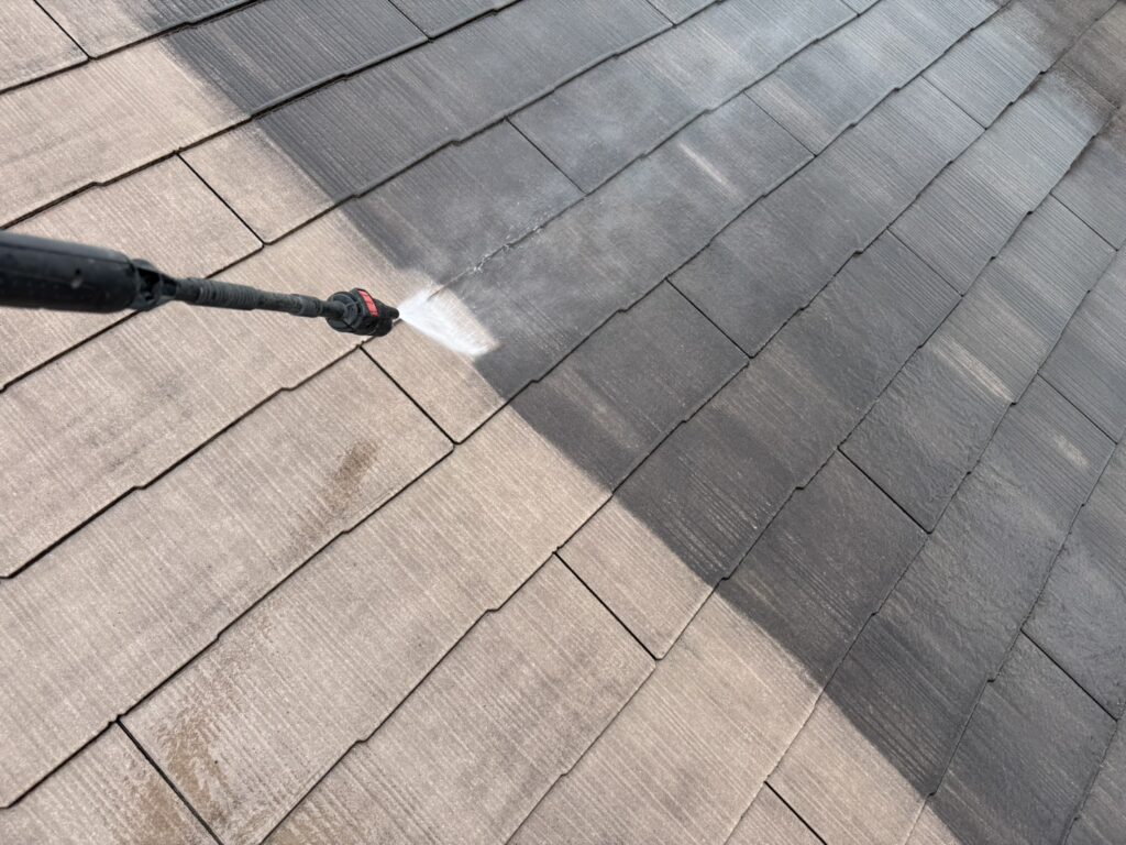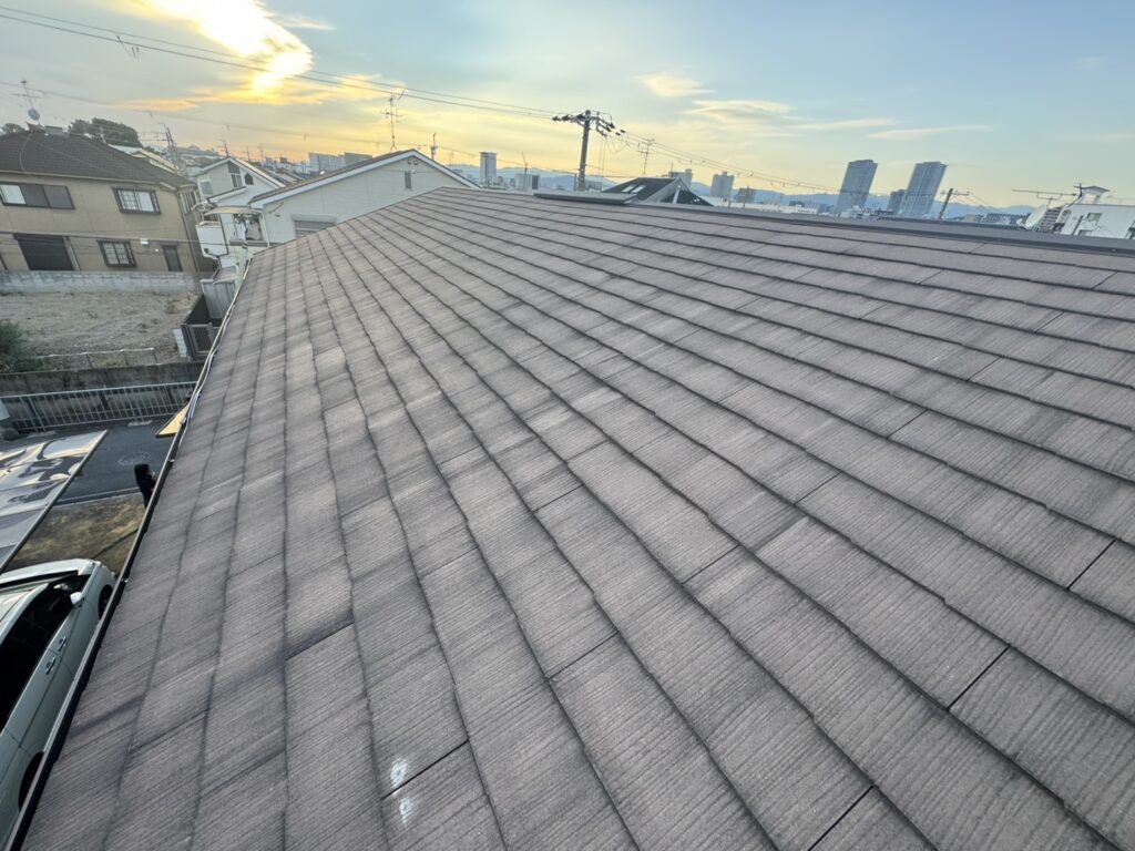 こちらが施工前の屋根の状態です。全体的に色あせや汚れが見られ、表面が劣化して光沢も失われていました。