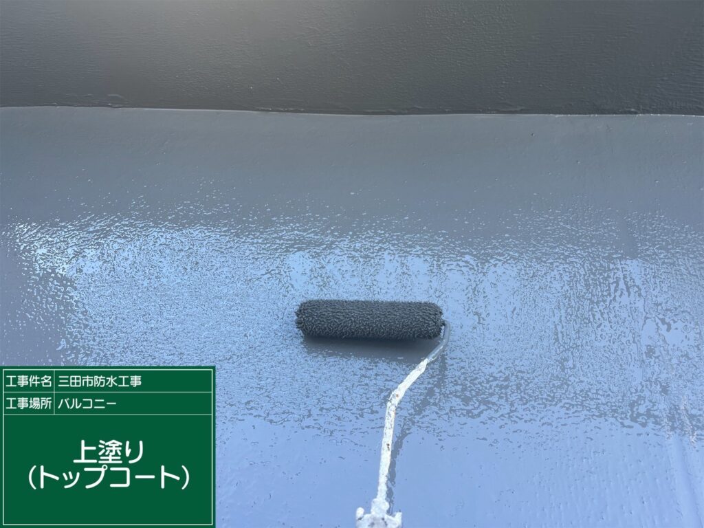 表面はツヤのある仕上がりで、雨水の浸入も防ぎます。安心して長くお使いいただけるベランダに仕上がりました。