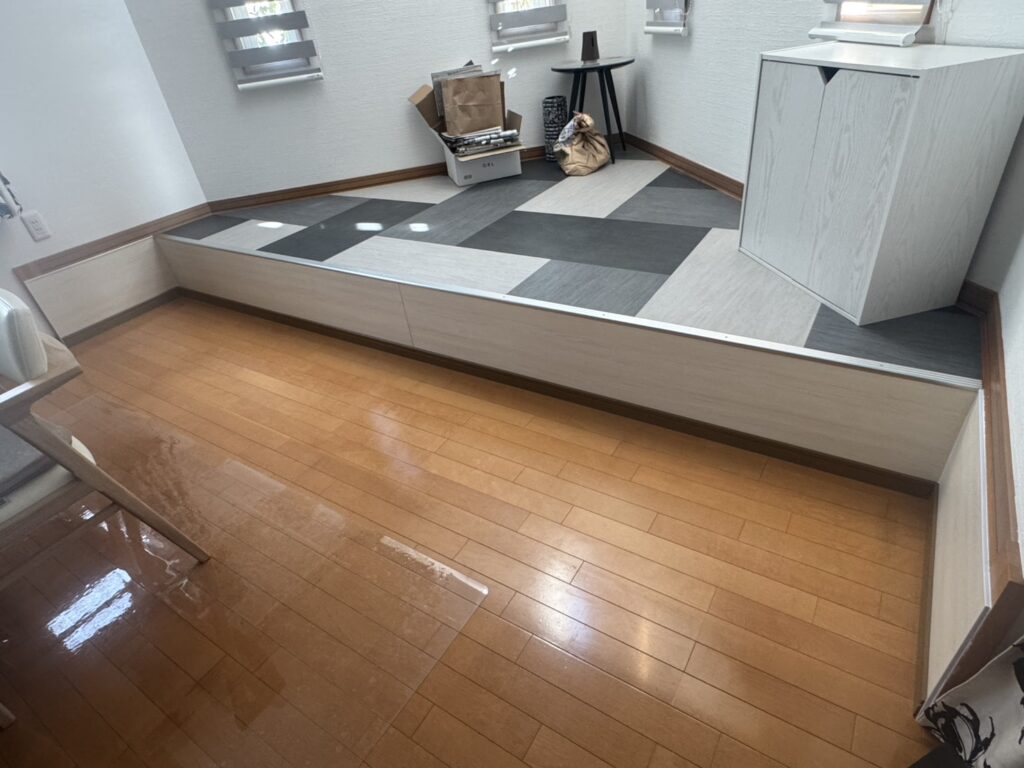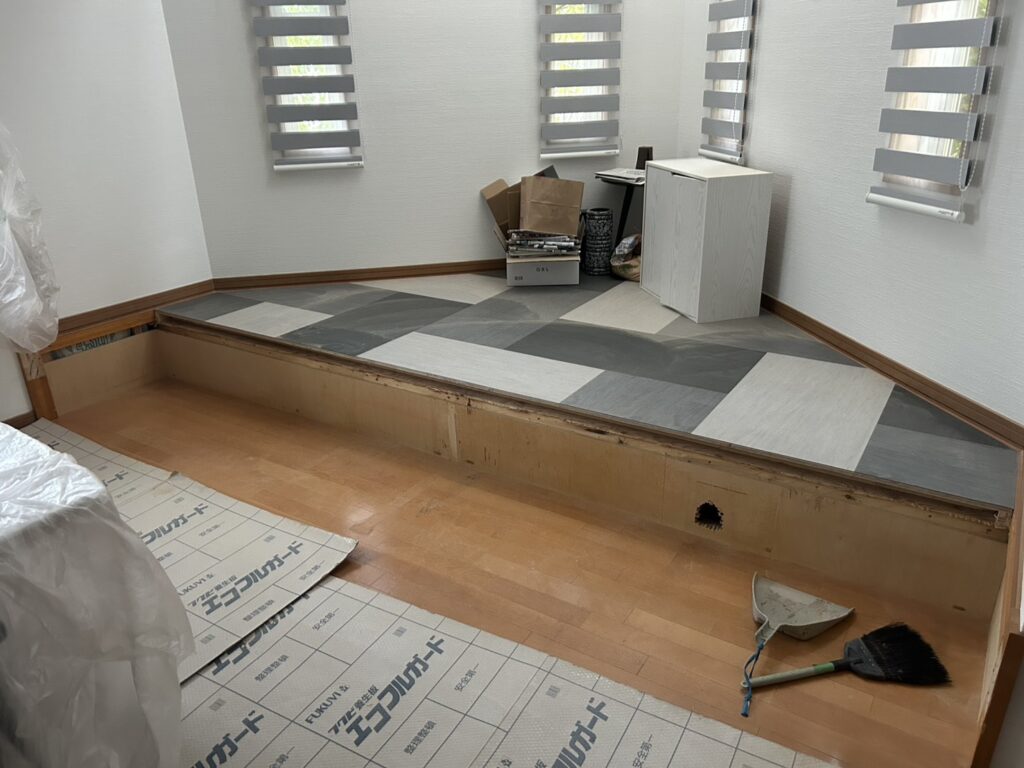 今回は、リビングにある桟敷(さじき)を解体して、床をフラットにし、リビングの面積を広くする工事を行いました。