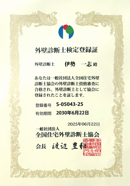 会社名 一工務店 設立 2022年9月1日 代表者 伊勢 一志 所在地 〒660-0893 兵庫県尼崎市西難波町1丁目31−7 TEL 080-3848-9396 事業内容 屋根工事全般塗装工事全般外装工事外構工事エクステリア工事全般 主な保有資格 一般社団法人 全国住宅外壁診断士協会認定番号:S-05043-25日本ペイント株式会社 GOOD JOB保証加盟店登録番号:T05069